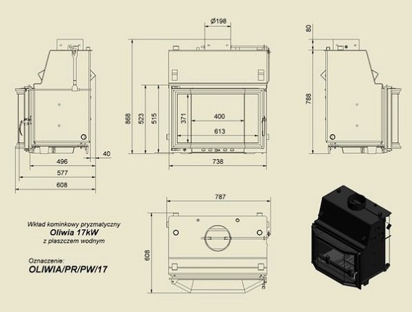 Дровяная топка с призматическим стеклом. Объем теплообменника у нее 35 л. Корпус выполене из 4мм котловой стали и подходит для работы при высоких температурах. Дверца и топочная камера чугунные. С помощью топки Oliwia/PR/PW/17 можно согреть дом площадью 140-170 кв.м