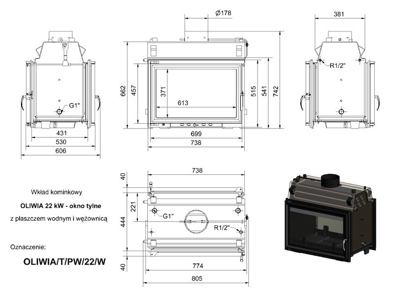Топка с водяным контуром OLIWIA/T/PW/22/W/Z, тунельная, змеевик
