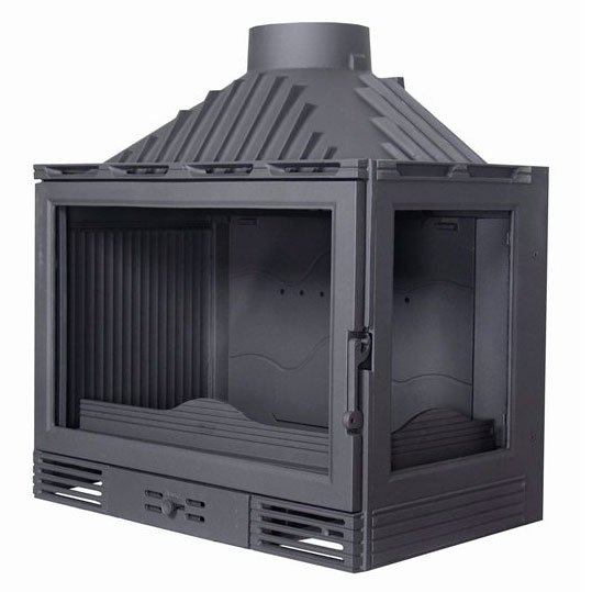 Каминная топка из чугуна. Прямой фасад. Стекло справа. Топка работает на дровах.