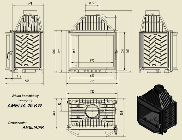 Топка изготовлена из толстого чугуна, ширина стенки 8-10 мм. Благодаря конструкторским особенностям увеличен нагрев поверхности вставки. Дровяная топка Ameliа имеет призматическое термостойкое стекло, способное выдержать температуру до 800 градусов Цельсия.