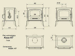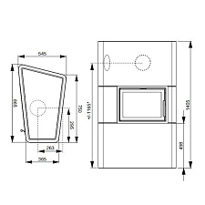 Закрытая топка , металлическая структура окрашеная в темно серый цвет. Дверца с выпуклым стеклом. Версия N = с натуральной конвекцией. В верхней части короба топки предусмотрены 4 отверстия для подключения набора разводки горячего воздуха. Топка укомплектована системой двойного дожига.