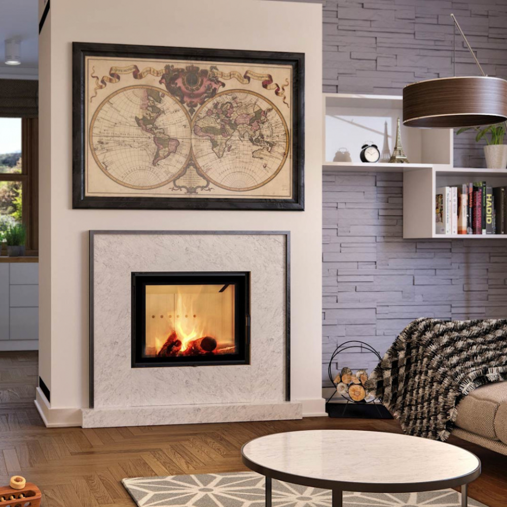 - Декоративная стеклянная панель типа glass, которая выдерживает температуру до 660 °C и предоставляет камину современного и элегантного вида, оптически увеличивает переднюю часть топки.