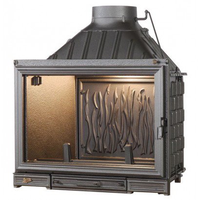 Декоративная внутренняя стенка. Толщина стенки топки от 8 мм до 12 мм обеспечивает более длительный и безопасный период эксплуатации топки. Заслонка, установленная на уровне вентиляционной трубы приемной камеры, позволяет избежать потерь тепла в дымоходе. За счет толстостенного и качественного чугуна, а также оптимального расположения конвекторов с большой площадью теплоотдачи холодный воздух помещения очень быстро нагревается.