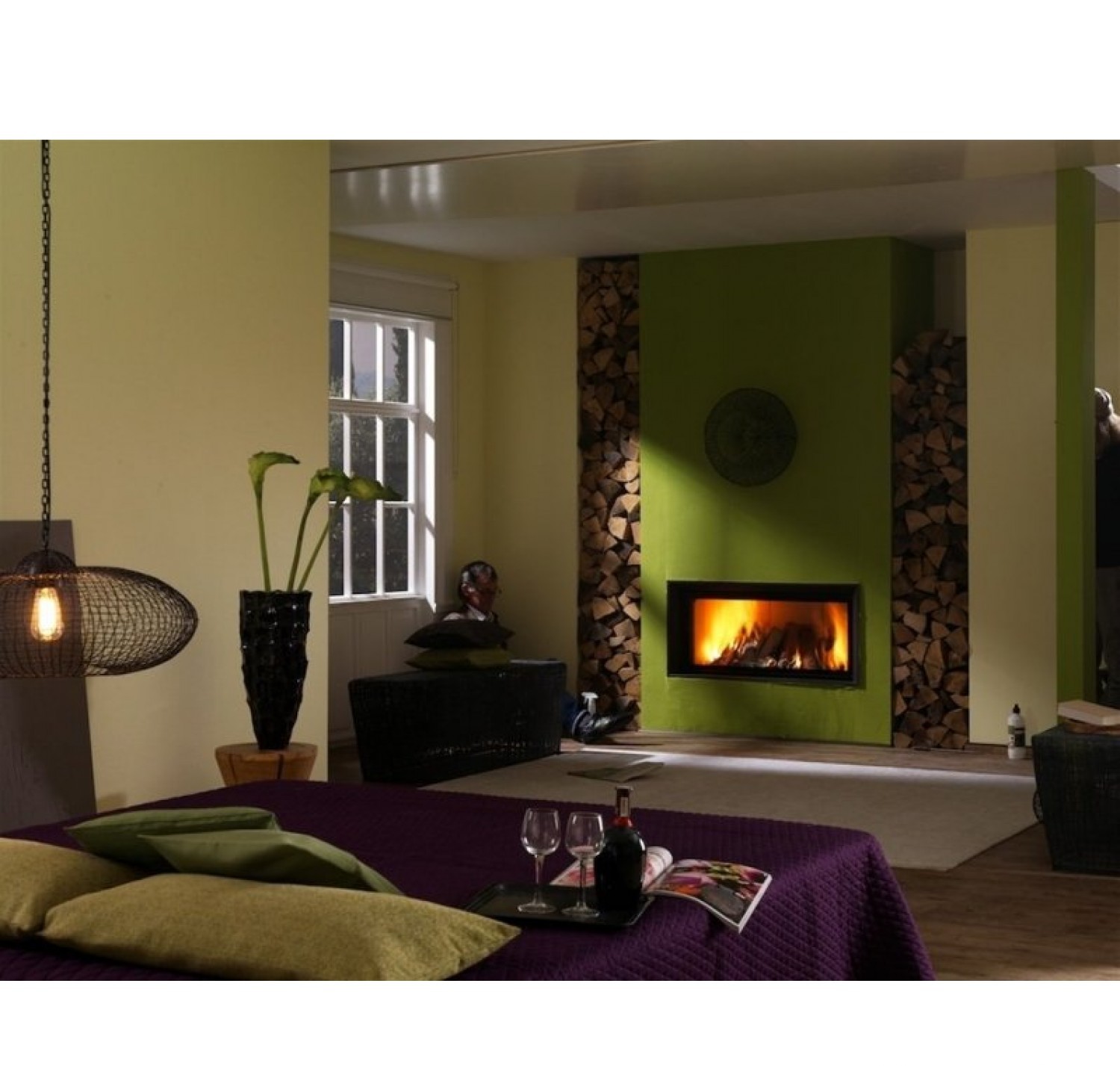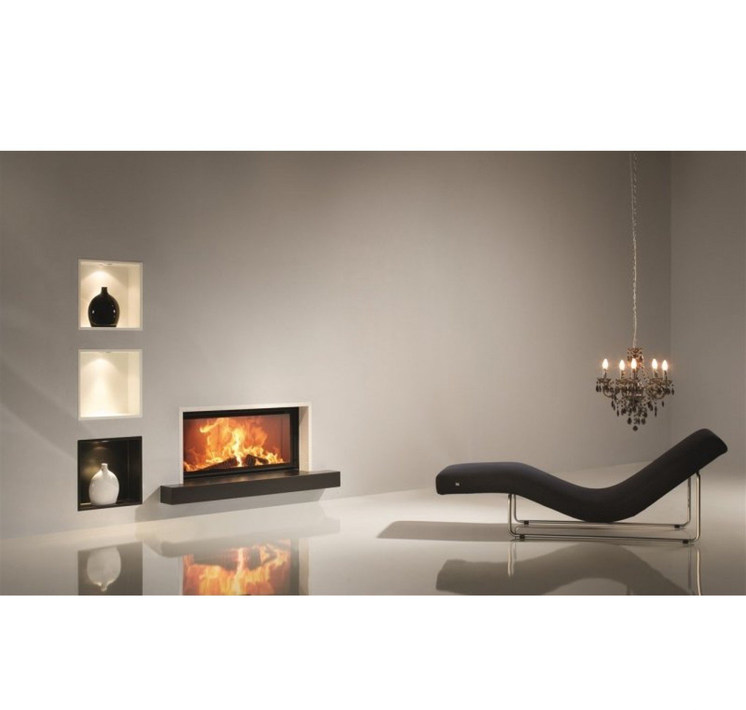 Каминная топка с прямым стеклом. Уменьшенная монтажная глубина. Топочная камера футерована шамотом. Подъёмный механизм двери (система Easy-Lift). Ширина дверки 1010 мм. Высота дверки 458 мм. Возможно подключение воздуха извне.