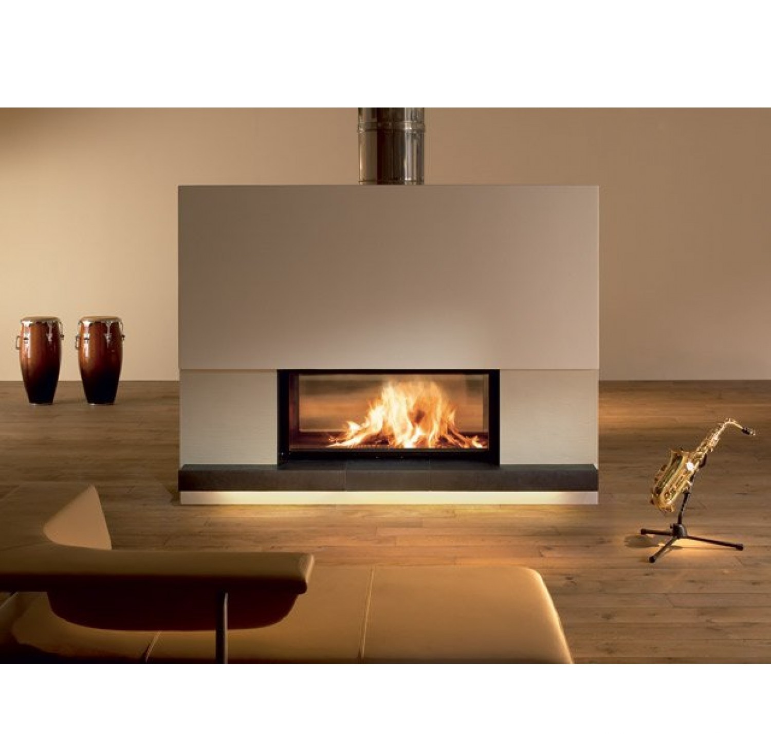 Двухсторонняя каминная топка с прямым стеклом. Топочная камера футерована шамотом. Подъёмный механизм двери (система Easy-Lift) с одной стороны. С другой стороны дверца откидывается для чистки. Возможен вариант топки с подъёмным механизмом с двух сторон. Ширина дверки 900 мм. Высота дверки 758 мм. Возможно подключение воздуха извне.