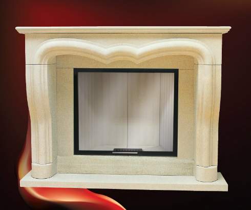 Камин с декоративными колоннамии выпуклым рельефом. Классическая облицовка под закрытую топку с прямым стеклом.