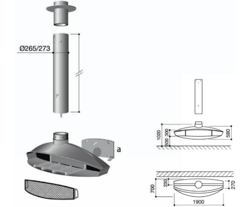 Подвесной или фиксированный у стены камин с широким отверстием (1,95 м), способный вместить исключительно длинные дрова.