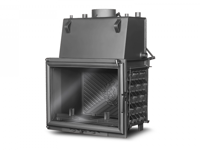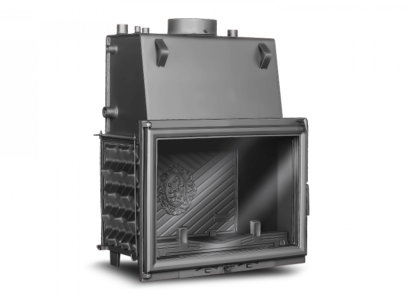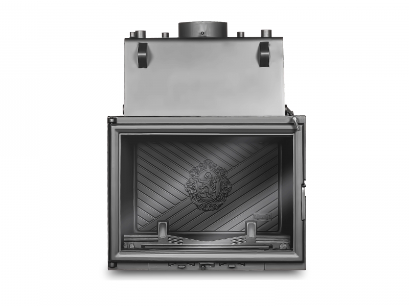 Каминная топка с водяной рубашкой W11 CO-18 кВт представляет собой топку W11 мощностью в режиме конвекции 10,1 кВт с установленным в верхней части топки водонаполненным теплообменником мощностью 7,9 кВт, такие отличные характеристики позволяют отапливать частный дом или административное здание площадью до 180 м.кв., а учитывая великолепную цену топки и топлива получить не только качественный дизайнерский отопительный прибор, а также красивый предмет интерьера с живым огнём. Жаростойкая плита в задней части топки декорирована гербом со львом.