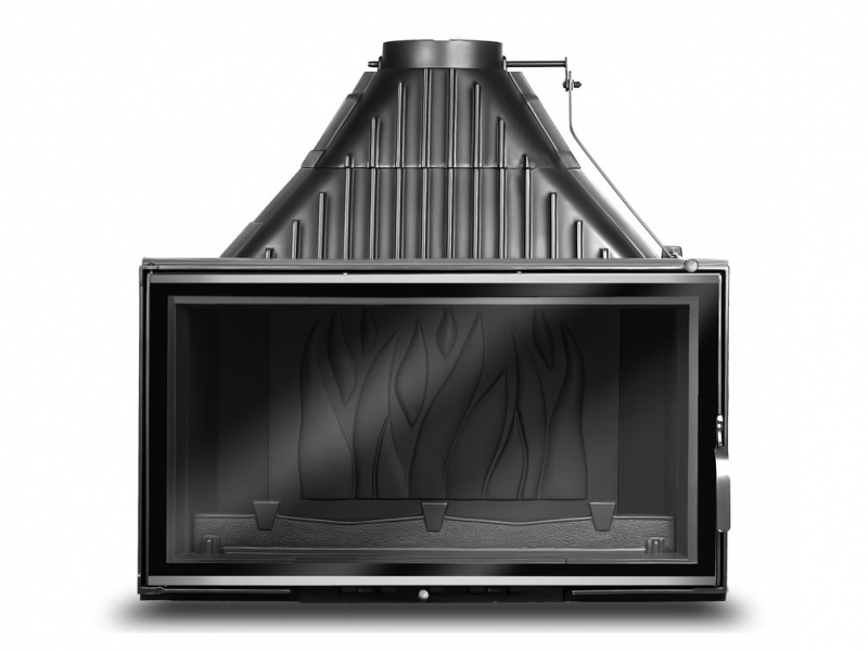 Повышенный КПД и теплоотдачу обеспечивает чугунный дефлектор, который расположен над камерой сгорания каминной топки KAWMET. Назначение дефлектора - направить недогоревшие частицы дровяного газа в центральную часть камеры сгорания, где происходит повторное догорание. Также дефлектор увеличивает тепловую эффективность топки путем удлинения пути прохождения продуктов сгорания.