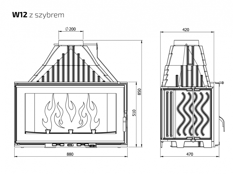 Каминная топка W12-19,4 кВт является классической топкой премиум класса производимой заводом KAWMET по современным технологиям, топка выполнена из толстого чугуна класса EN-GJL- 200 и оборудована подводом наружного воздуха в камеру сгорания, встроенным шибером для регулировки процесса горения и дымоотведения, и более точной регулировкой подачи воздуха через нижнюю часть дверцы под колосниковую решетку, открыв ее на максимум, вы подаете к дровам оптимальное количество воздуха для быстрого розжига.