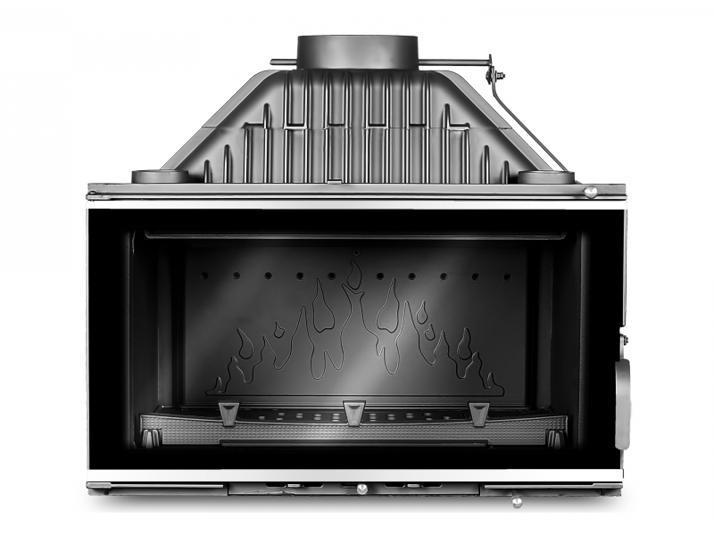 Для защиты корпуса каминной топки в конструкции топочной камеры также установлена двойная задняя стенка с красивым и объёмным рисунком, которая обеспечивает долговечность каминных топок KAWMET.