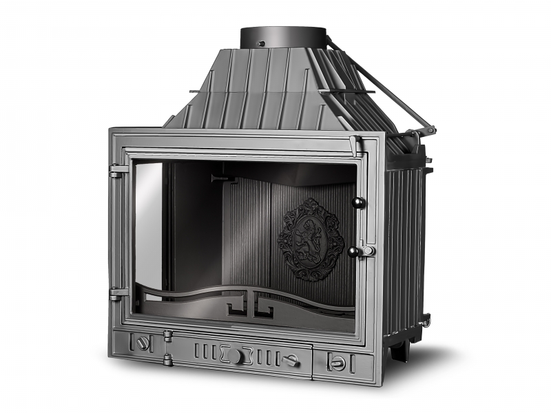 Классическая боковая каминная топкаKaw-Met W3 pb/lb с дополнительным стеклом для наслаждения игрой живого укрощенного огня с нескольких сторон, используется для отопления помещений как качественный дизайнерский отопительный прибор, а также как предмет интерьера. Жаростойкая плита в задней части топки декорирована гербом со львом.