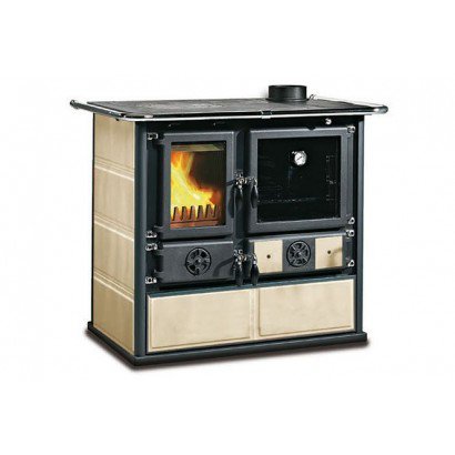 Устройство оснащено крупной духовкой и одноконфорочной варочной поверхностью. Топка агрегата выполнена из чугуна и снабжена панорамным стеклом крупного размера. Конструкцией предусмотрен ящик для складирования и просушки поленьев. Рама, кольца и пластины модели изготовлены из чугуна. Имеется система регулировки воздуха (первичного и вторичного).
