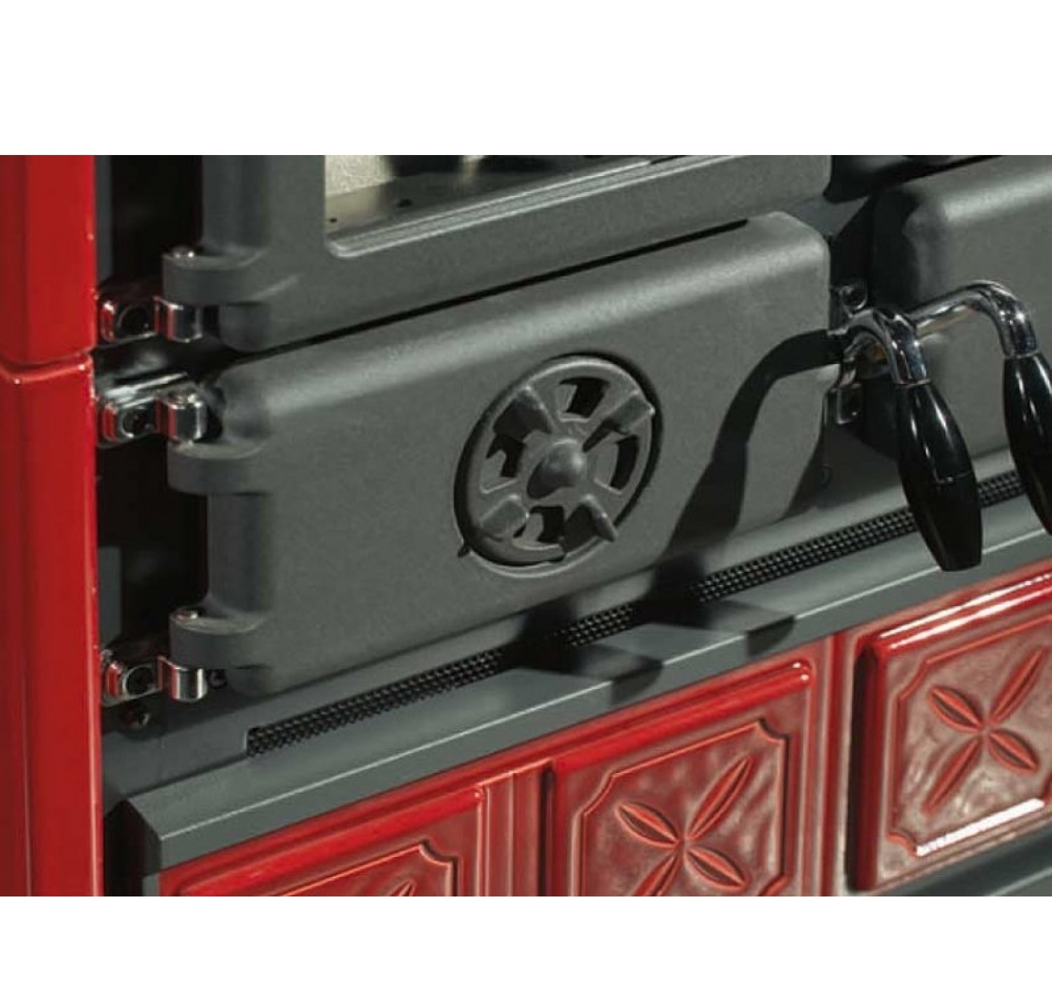 Печь оборудована крупной духовкой и варочной панелью, состоящей из одной конфорки. Топка из высококачественного чугуна оснащена дверцей со стеклокерамическими вставками, сквозь которые можно наблюдать за процессами горения. Печь оборудована удобным ящиком для складирования и предварительной просушки дров. Rosetta Maiolica снабжена также системами регулировки воздуха (первичного и вторичного).
