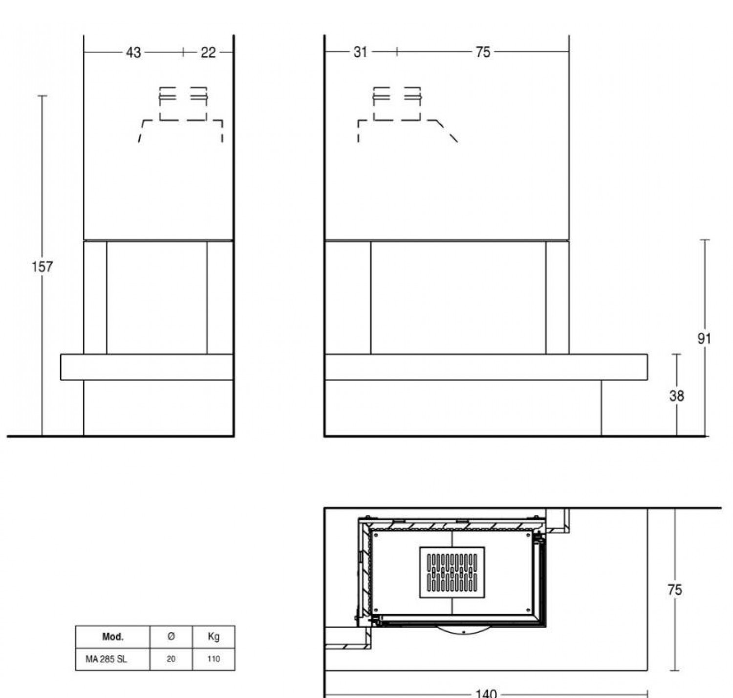Опора основания, как и боковые панели, выполнена из мрамора. Банкетку можно установить слева или справа, и можно полностью отказаться от её установки, что позволит сократить пространство. В камин устанавливается топка с угловым стеклом, которая позволяет пламени выглядеть особенно привлекательно.