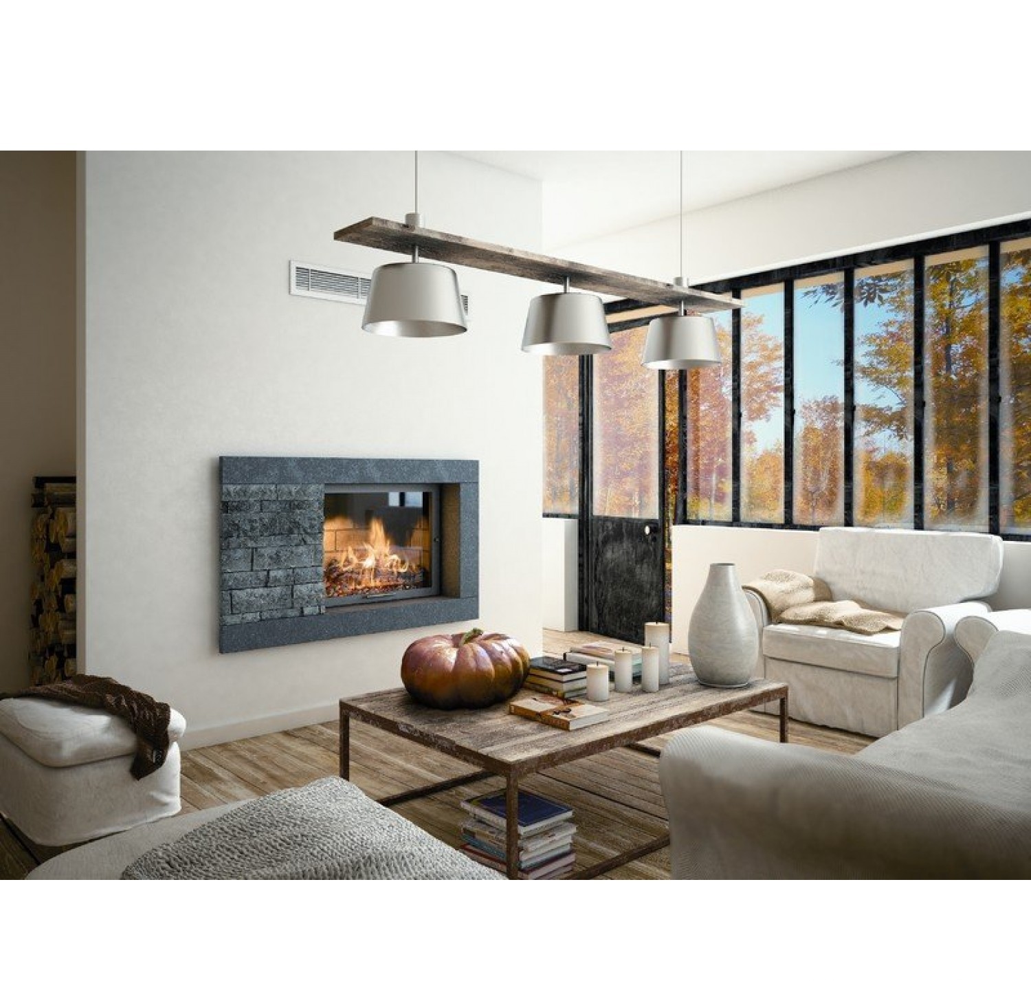 Каминная топка оснащена системой очистки стекла, встроенным шибером и системой подводки внешнего воздуха в камеру сгорания, а также оборудована цепным механизмом подъема двери, съемной колосниковой решеткой и ножками, которые дадут возможность установить топку на неровной поверхности.