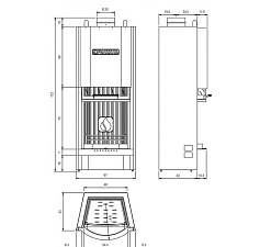 Дверь топки полностью поднимается вверх, тем самым не мешая обзору пламени. Для чистки стекла дверь открывается в бок. Дымоход контролируется шибером , регулирующим тягу.
