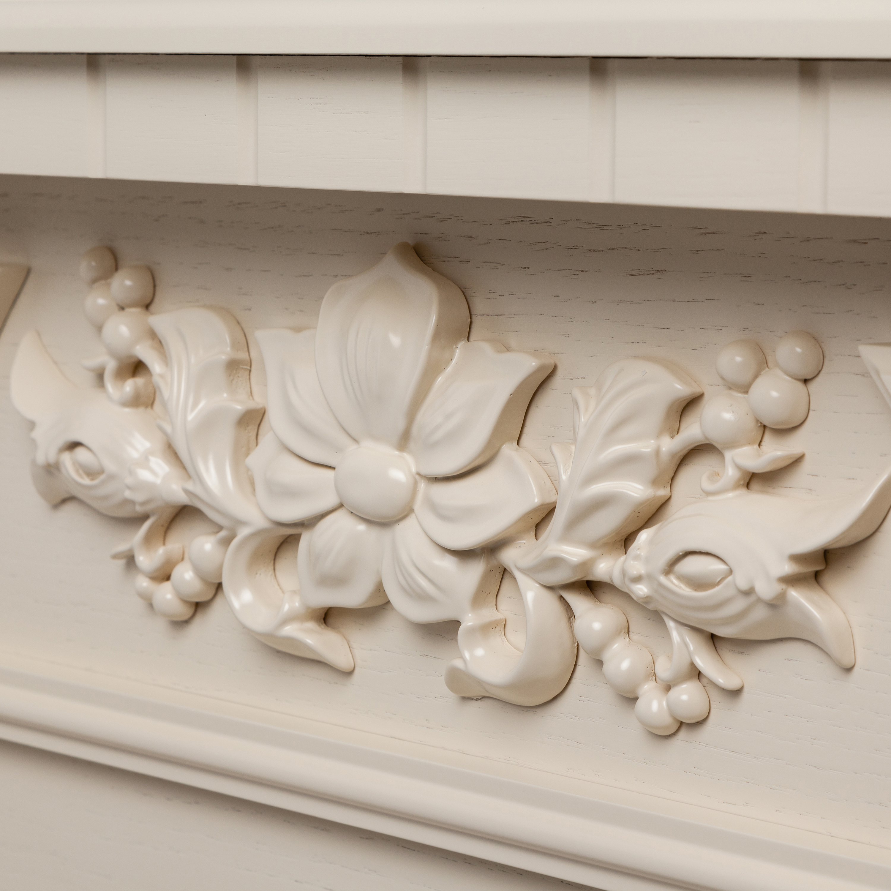 - Портал каминокомплекта выполнен в классическом стиле, отличаясь богатым, но ненавязчивым декором. Боковые панели украшены колоннами, верхняя часть которых оканчивается прямоугольными вставками с розетками, в оформлении которых прослеживаются растительные мотивы. Верхняя панель над очагом также украшена растительным орнаментом и плоскими вставками. Верхняя часть портала оформлена каминной крышкой, которая по бокам спереди имеет выступы над колоннами. Кромка каминной крышки оформлена геометрической резьбой. Устанавливается вся конструкция на невысокое основание.