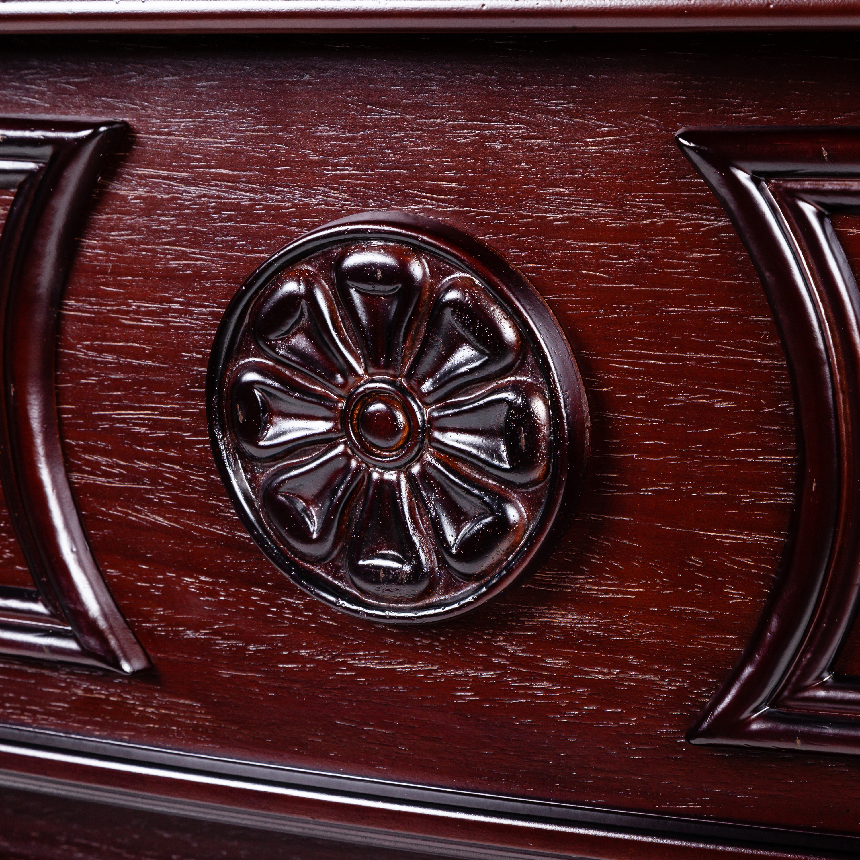 - Выполнен из качественного МДФ и тонированного шпона. Украшен резьбой по дереву и колоннами.