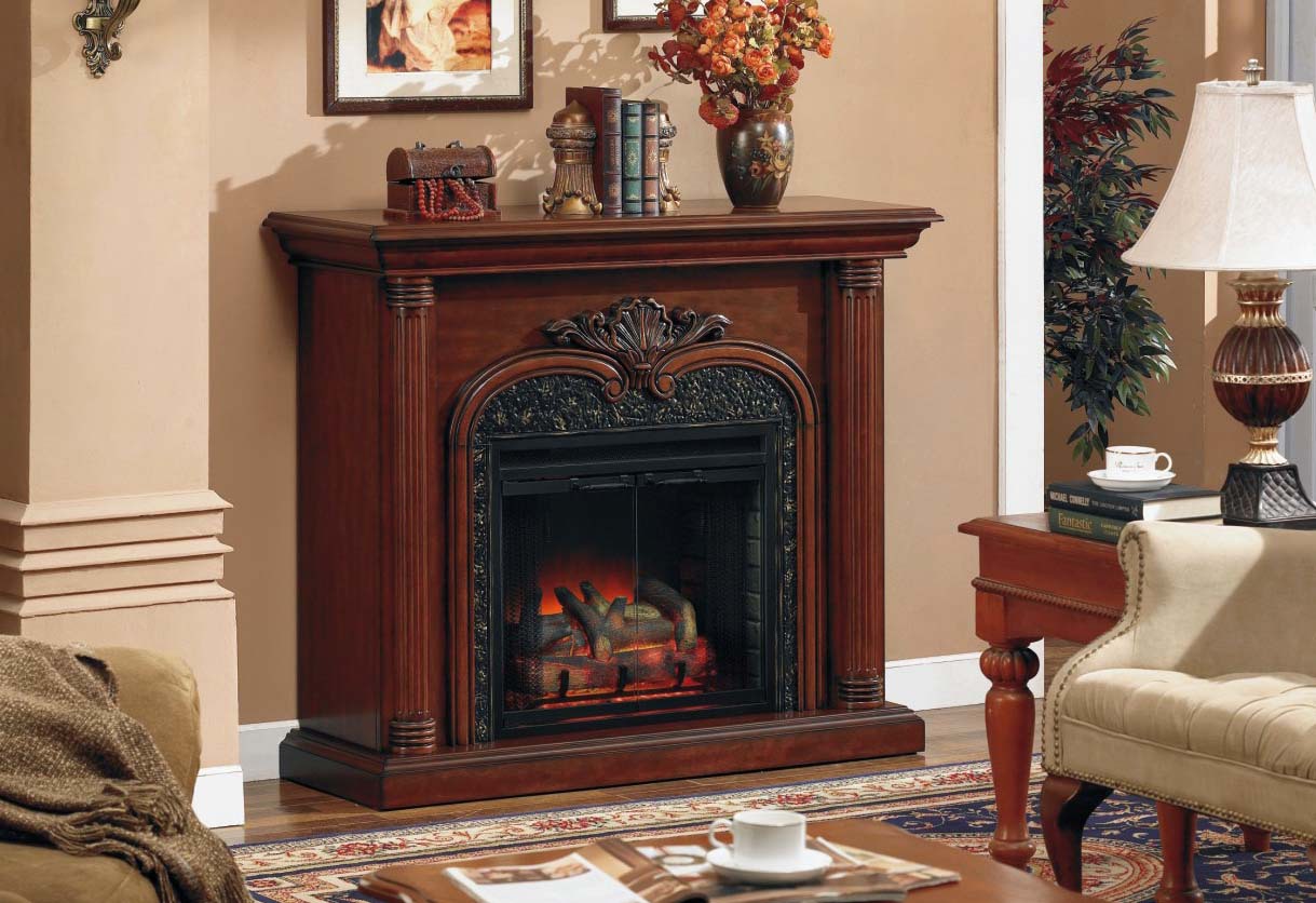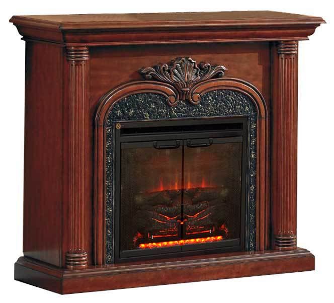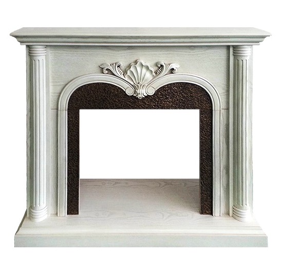 - Изящная резная отделка и панель под металл вокруг очага. Колонны делают обрамление более привлекательным.