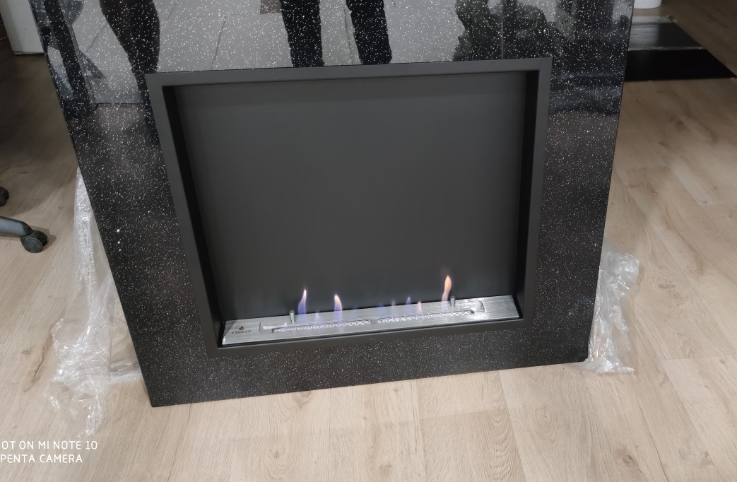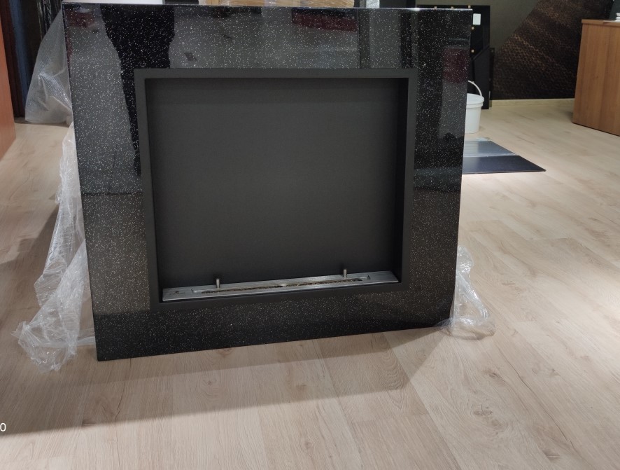 Биокамин Firezo New York изготовлен из металла толщиной 2 мм и портала из искусственного мрамора с черной переливающийся крошкой.
